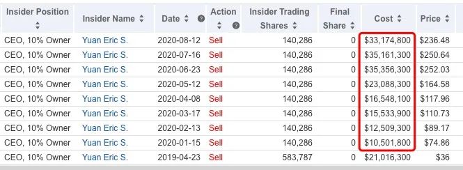 据雅虎财经数据,今年以来,Zoom的CEO袁征已卖出Zoom股票至少8次,总共套现1.82亿美金,约合12亿人民币。