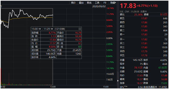 A股方面,圆通速递(600233.SH)股价开盘小幅震荡后便直线拉升,盘中一度触及涨停。截至上午收盘,涨6.77%,报收每股17.83元,成交金额25.75亿元。
