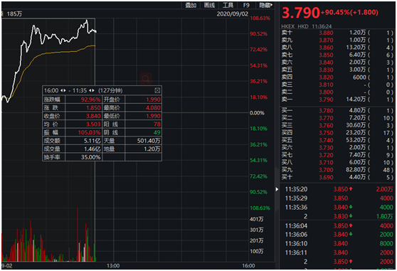 圆通港股则涨势更猛,圆通速递国际(6123.HK)开盘后股价一路飙升,最高涨超100%,截至上午发稿,涨92.46%,报收每股3.84港元,成交金额5.11亿港元。