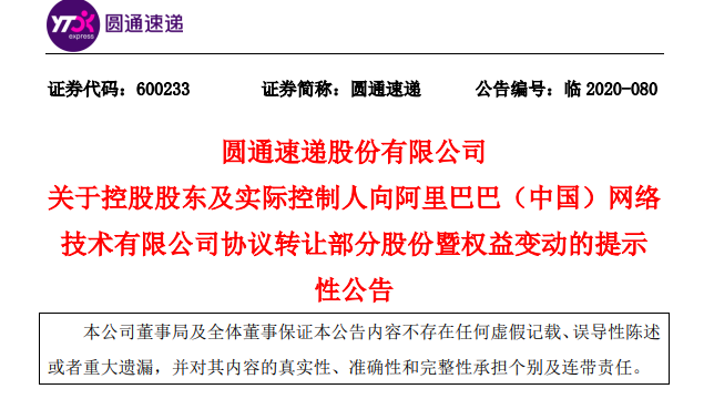 9月1日晚,圆通速递公告称,公司控股股东上海圆通蛟龙投资发展(集团)有限公司(简称“蛟龙集团”)、喻会蛟、张小娟与阿里巴巴集团内企业阿里巴巴(中国)网络技术有限公司(简称“阿里网络”)签署《股份转让协议》,拟以17.406 元/股向阿里网络转让 3.79亿股股份,占公司股份总数的 12%,转让总价款为66亿元。