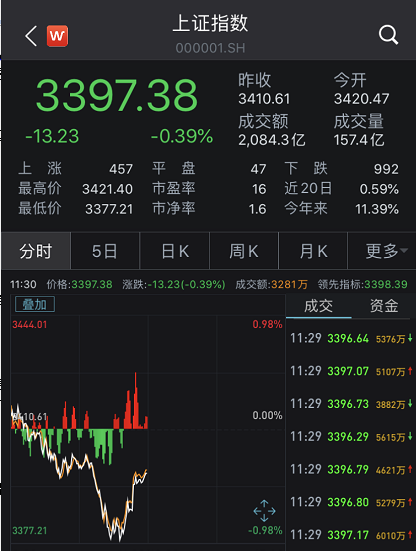 上午两市高开低走,上证指数盘中一度跌约1%,而后V起跌幅收窄跌0.39%,仍失守3400点,深证成指微涨0.03%,创业板指上涨0.37%,两市成交额5834亿元。板块方面,旅游、环保、传媒、物流、元器件、农林牧渔等走强,有色、军工、能源、金融等跌幅靠前。