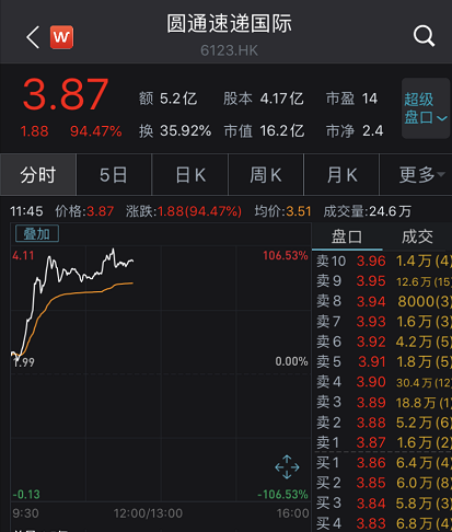 H股的子公司圆通速递国际股价则一度大涨100%。