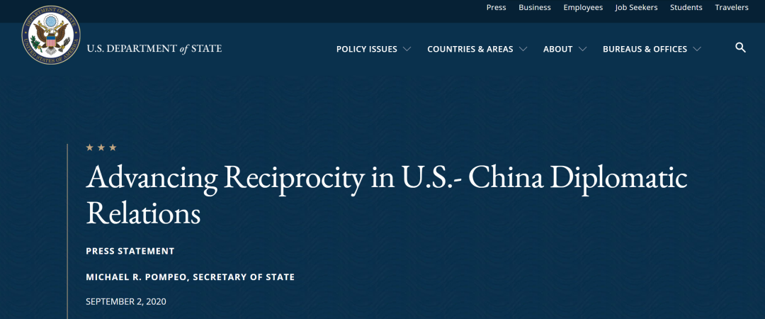蓬佩奥在简报会上说:“今天我要宣布,美国国务院已经制定了一种机制,中国在美的高级外交官,需要获得许可才能访问大学校园以及与地方政府官员会面;在中国大使馆外交驻地以外举办人数超过50人的文化活动, 也需要获得许可。”他还宣称,此举是对北京的回应。