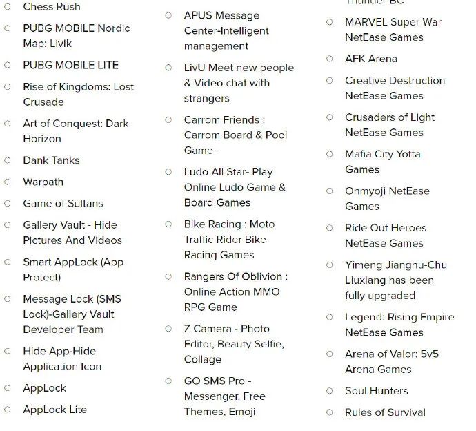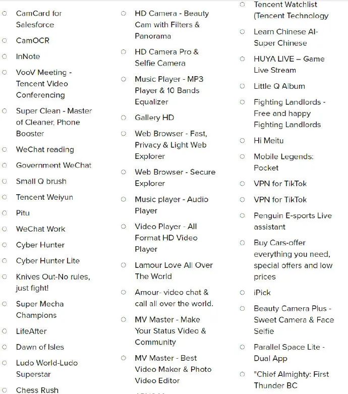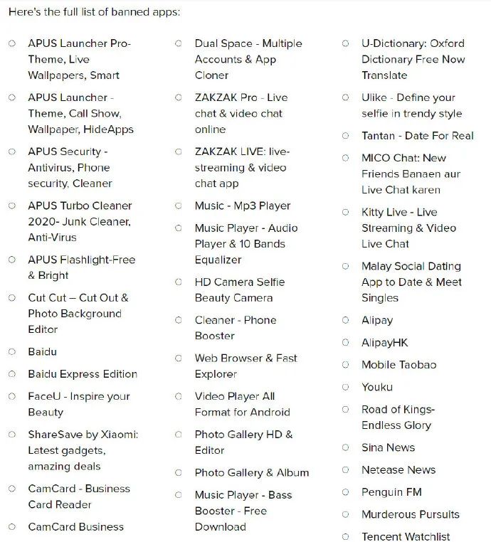 本次被封禁的应用涵盖视频、社交、工具、直播、电商、支付、游戏几乎所有互联网应用类别,包括腾讯旗下的微信企业版(WeChat Work)、微信读书(WeChat Reading)、以及腾讯“吃鸡”手游绝地求生的轻量版(PUBG Mobile Lite)、其投资的虎牙直播(HUYA LIVE – Game Live Stream)、百度(Baidu)、阿里巴巴旗下优酷(Youku)、手机淘宝(Mobile Taobao)、支付宝(Alipay)。