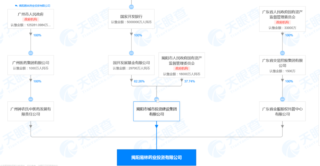 《国际金融报》记者查询后发现,易林投资的3位股东均“来头不小”。揭阳市城市投资建设集团有限公司由国家开发银行间接持股62.26%、揭阳市国资委直接持股37.74%;广东省金服股权托管中心有限公司由广东省交易控股集团有限公司100%,背后是广东省国资委100%控股;广州神农氏中医药发展有限责任公司由广州医药集团有限公司100%控股,背后是广州人民政府100%控股。
