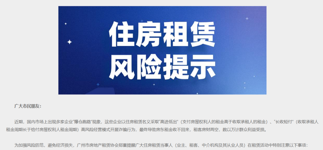 同日,广州市房地产租赁协会也发布《住房租赁风险提示》指出,近期,国内市场上出现多家企业“爆仓跑路”现象,这些企业以住房租赁名义采取“高进低出”(支付房屋权利人的租金高于收取承租人的租金)、“长收短付”(收取承租人租金周期长于给付房屋权利人租金周期)高风险经营模式开展诈骗行为,最终导致房东租金收不回来,租客房财两空,数以万计群众利益受损。