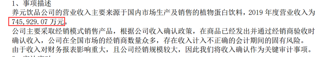 而养元饮品主营产品为六个核桃系列,该公司依靠六个核桃单品起家。2019年年报显示,养元饮品的主营业务为植物蛋白饮料,占营收比例99.96%。