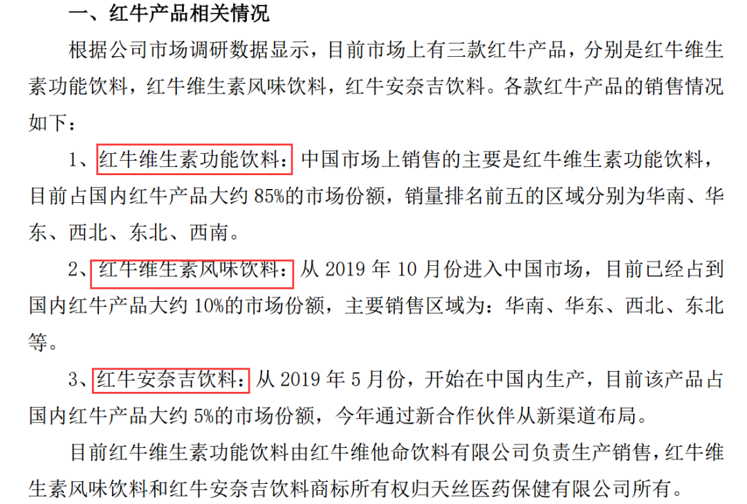 中国市场上销售的主要是红牛维生素功能饮料(华彬红牛),目前占国内红牛产品大约85%的市场份额。养元饮品将经销的产品为天丝旗下红牛安奈吉饮料系列产品,从2019年5月份开始在中国内生产,目前该产品占国内红牛产品大约5%的市场份额。