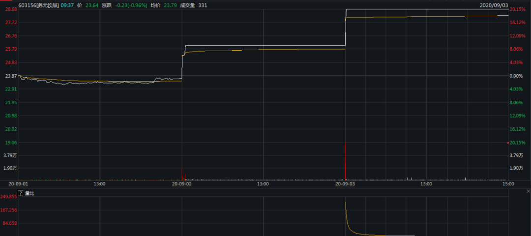 9月3日开盘不久,养元饮品即再度涨停。截至收盘时,股价涨10.01%报28.68元/股,成交额3.18亿元,换手率1.47%,最新总市值363亿元。股价两个交易日上涨21%,市值增加64亿元。