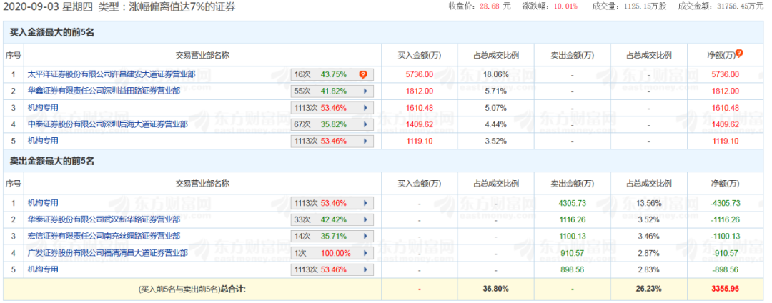 期间买入前五名的营业部分别为,太平洋证券许昌建安大道营业部、机构专用席位、方正证券上海杨高南路营业部、华鑫证券深圳益田路营业部、中金公司深圳福华一路营业部,买入额合计1.52亿元。