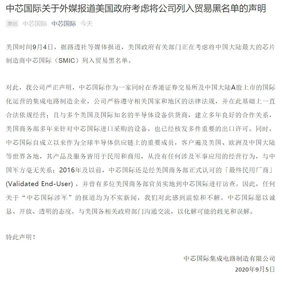 对此,中芯国际于9月5日发布声明称,中芯国际作为一家同时在香港证券交易所及中国大陆A股上市的国际化运营的集成电路制造企业,公司严格遵守相关国家和地区的法律法规,并在此基础上一直合法依规经营;且与多个美国及国际知名的半导体设备供货商,建立多年良好的合作关系,美国商务部多年来针对中芯国际进口采购的设备,也已经核发多件重要的出口许可。