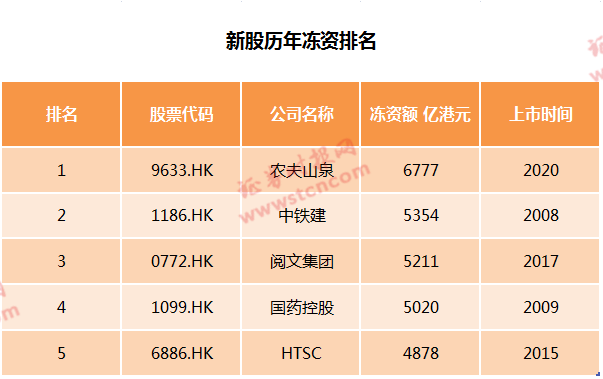 9月7日,农夫山泉(9633.HK)公布认购分配结果,一共有70.75万人申购,可见投资人打新热情。按招股价上限21.5港元,计及手续费所需资金,农夫山泉冻资6777亿港元,超额认购1147.3倍,成为香港IPO史上最大冻资王。