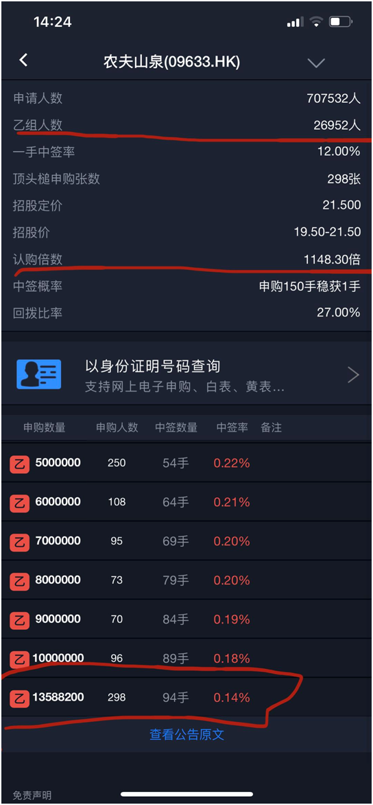 农夫山泉一手中签率12%,即每申购150手稳获1手,每手200股,入场费约4343港元。结果显示,一共有21.55万人认购一手,当中约2.59万人获分配,298人俗称“顶头锤飞”(即申购上限)认购,每人认购逾1358万股,合计冻资超过870亿港元,每人获分1.88万股或94手。