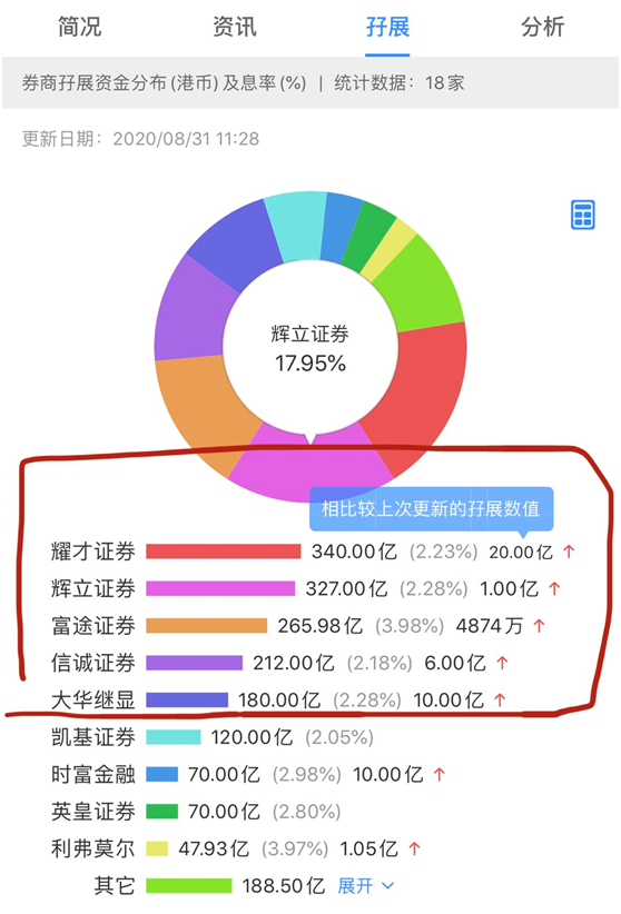 根据AIPO数据显示,前五大券商孖展融资合计1324.98亿港元,其中耀才证券孖展融资340亿港元,辉立证券孖展融资327亿港元,富途证券孖展融资265.98亿港元,信诚证券孖展融资212亿港元,大华继显孖展融资180亿港元。