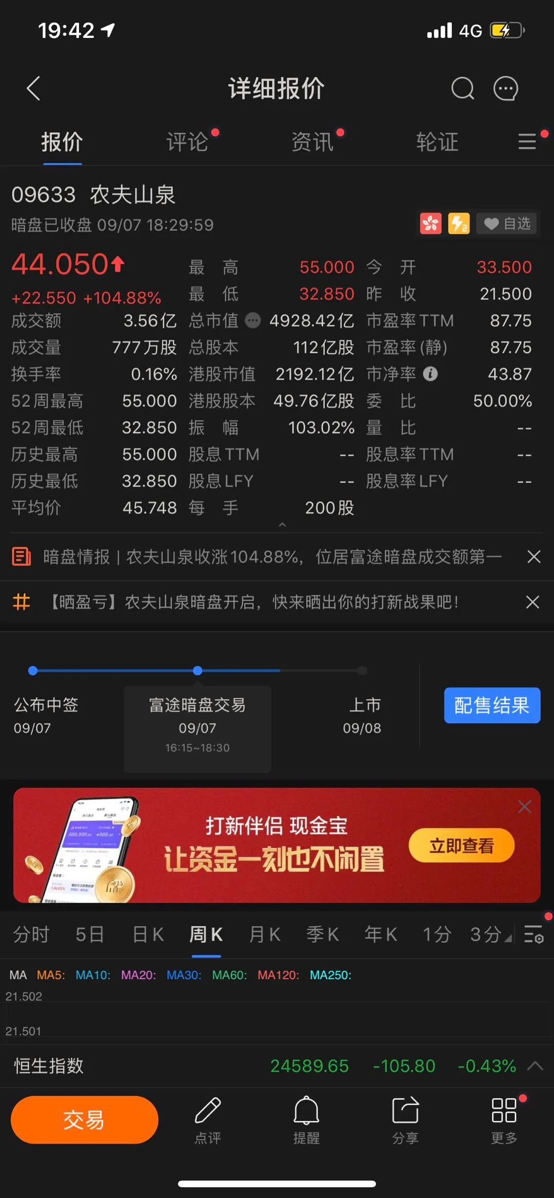 今日暗盘收盘,农夫山泉飙涨104.88%,报44.05港元,总市值达到4928.42亿港元。中签的投资者一手账面盈利4510港元(不包含手续费、交易费等相关费用)。