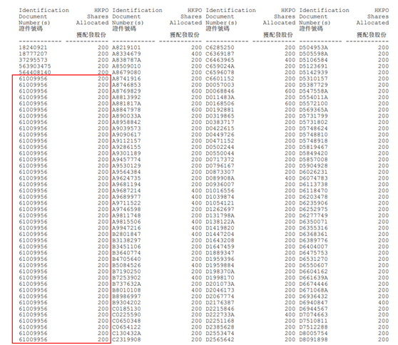 记者翻阅农夫山泉配售结果,与早前上市的沛嘉医疗和康方生物等一样,有大量中签证件号码相同,比如“61009956”这组号码重复出现多次,对散户来说,自然想到重复认购。