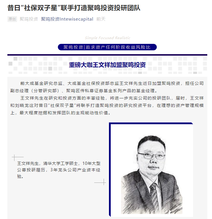 值得注意的是,聚鸣投资总经理刘晓龙在公募期间也曾管理过社保组合,2015年在18个社保组合中排名第1。聚鸣投资称,王文祥的加入,将进一步充实公司的投研团队,届时,王文祥和刘晓龙这对昔日“社保双子星”将联手打造聚鸣投资的研究投资平台,在理想的资产管理规模上,最大程度挖掘和发挥团队的主观能动性价值。
