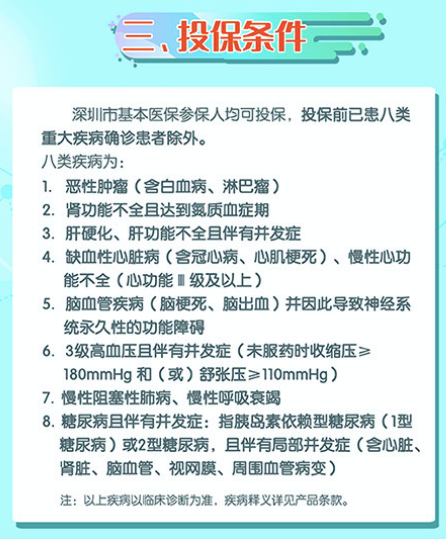 投保方面,除8类严重疾病患者人群,其他深圳市基本医疗保险参保人均可投保。分1年期和6年期两种方案:1年期每人次保费365元;6年期每人次保费1998元。