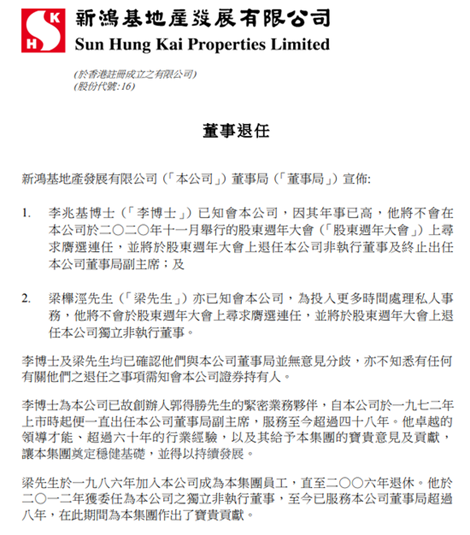9月10日,新鸿基地产发布公告称,李兆基博士,因其年事已高,将不在公司于2020年11月举行的股东周年大会上寻求膺选连任,并将于股东周年大会上退任公司非执行董事及终止出任公司董事局副主席。公告显示,李兆基自公司于1972年上市时起一直出任公司董事局副主席,服务至今超过48年。