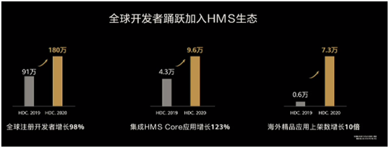 张平安表示,全球开发者踊跃加入HMS生态。华为目前已拥有180万开发者,同比增长98%;HMS集成应用9.6万个,同比增长123%;海外精品应用上架数增长10倍至7.3万个。此外,华为应用市场已成为全球top3的应用市场。