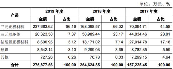 2017年至2019年,长远锂科的营业收入分别为15.72亿元、25.46亿元、27.59亿元,其中三元正极材料占主营业务收入的比重连续上升,分别为44.58%、66.02%、86.16%。