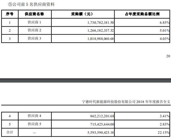 前五大供应商摘要,数据来源:宁德时代2018年年报