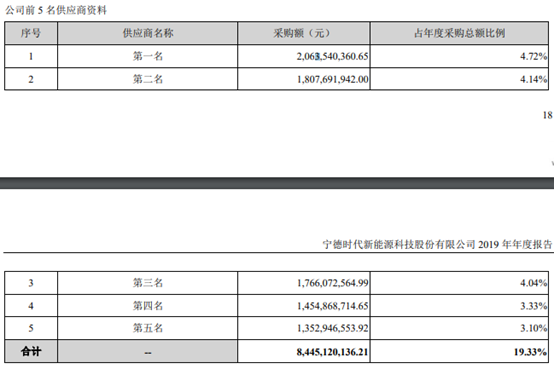 前五大供应商摘要,数据来源:宁德时代2019年年报