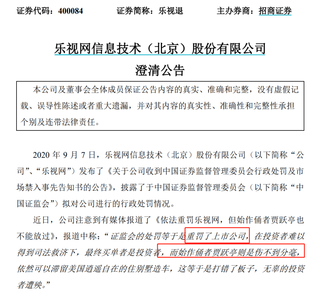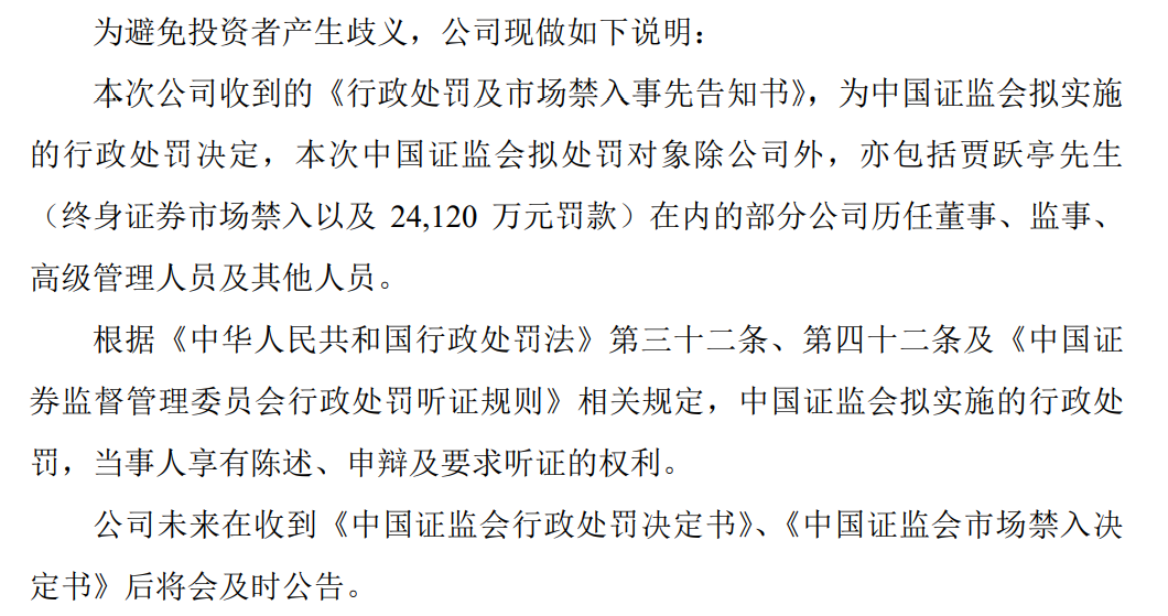 9月11日,乐视网对此发布澄清公告表示,为避免投资者产生歧义,公司9月7日公告的所收到的《行政处罚及市场禁入事先告知书》为中国证监会拟实施的行政处罚决定,本次中国证监会拟处罚对象除公司外,亦包括贾跃亭(终身证券市场禁入以及24,120万元罚款)在内的部分公司历任董事、监事、高级管理人员及其他人员。