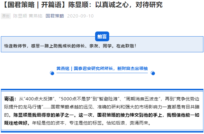 9月10日下午,微信公众号“国君策略”发布文章,《陈显顺:以真诚之心,对待研究》,将陈显顺接任的消息向市场公开。该公众号简介为国君策略陈显顺研究团队。