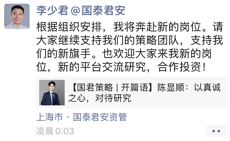 值得注意的是,李少君发布该朋友圈时定位为国泰君安资管,有国泰君安人士也向记者确认,李少君后期或将转入国泰君安的资管业务部门。