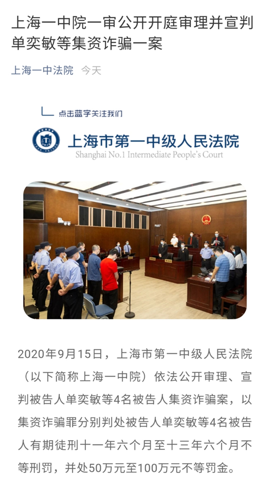 9月15日,上海市第一中级人民法院(以下简称“上海一中院”)发布消息显示,该院一审公开开庭审理并宣判单奕敏等集资诈骗一案,四名被告人均获刑超过11年。