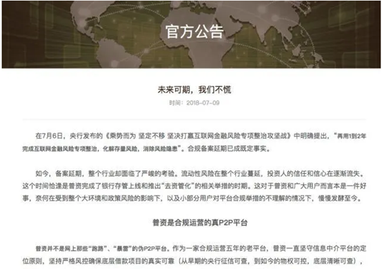 值得一提的是,就在2018年7月9日,普资金服官网还发布了一份名为《未来可期,我们不慌》的公告。在这份公告中,普资金服特意强调自己是“合规运营的真P2P平台”,并提到了目前宏观环境以行业整体环境以及流动性风险、政策风险。