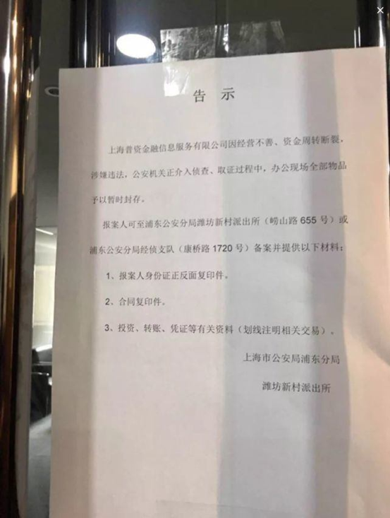 投资人在普资金服现场发现,该公司已经人去楼空。一份流传的公安局告示显示“上海普资金融信息服务有限公司因经营不善、资金周转断裂,涉嫌违法,公安机关正介入侦查、取证过程中,办公现场全部物品予以暂时封存。”
