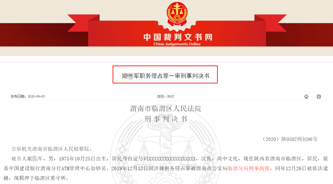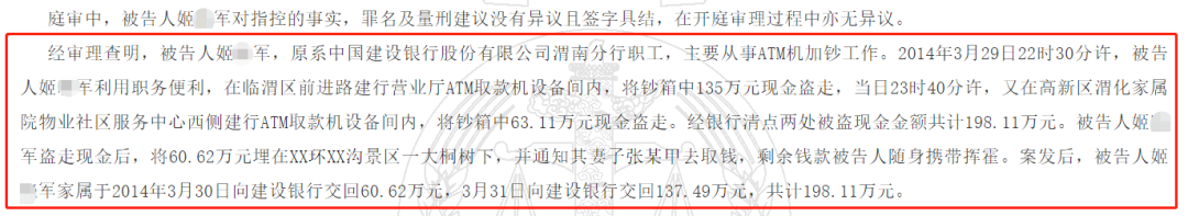 裁判文书显示,本案的被告人姬某军,男,1975年10月出生,高中文化,现住陕西省渭南市临渭区,原系中国建设银行渭南分行ATM管理中心加钞员,主要从事ATM机加钞工作。