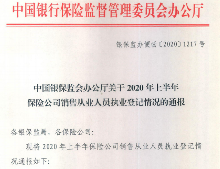银保监会称,总体来看,经过2019年销售人员执业登记数据清核及2020年上半年进一步整改,绝大部分保险公司提高了认识,完善了制度机制,加强了销售人员执业登记管理,销售人员基础数据质量明显好转。