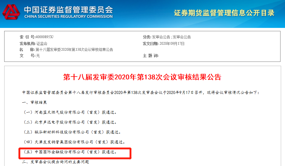 9月17日晚间,证监会网站公示了第十八届发审委2020年第138次会议审核结果公告,有5家公司首发获得通过,其中包括中国国际金融股份有限公司(首发)获通过,这意味着中金公司回A股IPO又进了一步,在顺利过会后,中金公司将进入发行环节。