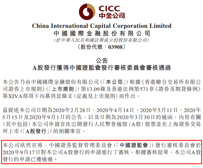 同时,昨晚中金公司在港股的公告里也宣布了这一消息:本公司欣然宣布,中国证监会发行审核委员会于2020年9月17日对本公司A股发行的申请进行了审核。根据审核结果,本公司A股发行的申请已获通过。