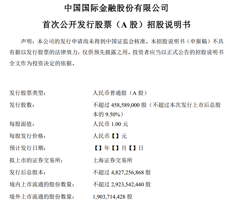 根据最新的招股书显示,中金公司此次拟登陆上交所上市,计划发行股数不超过4.59亿股,发行后总股本不超过48.27亿股。