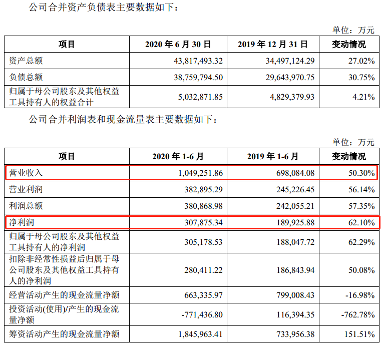 2020年上半年,中金公司保持稳健发展态势,投资银行业务、股票业务及投资管理业务收入均实现显著增长。2020年1-6月,公司实现营业收入104.93亿元,同比增长50.30%;实现归属于母公司股东及其他权益工具持有人的净利润30.52亿元,同比增长62.29%。