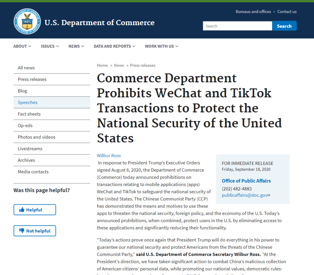 9月18日,美国商务部在其官网发布消息称,针对特朗普总统于2020年8月6日签署的行政命令,美国商务部今天宣布禁止与移动应用程序(app)WeChat和TikTok有关的交易,以维护美国的国家安全。