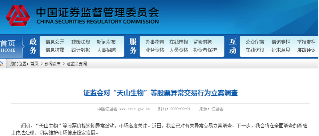 证监会9月21日晚间表示,近期,“天山生物”等股票价格短期异常波动,市场高度关注。证监会已对有关异常交易立案调查。下一步,证监会将在全面调查的基础上依法处理,切实维护市场健康稳定发展。