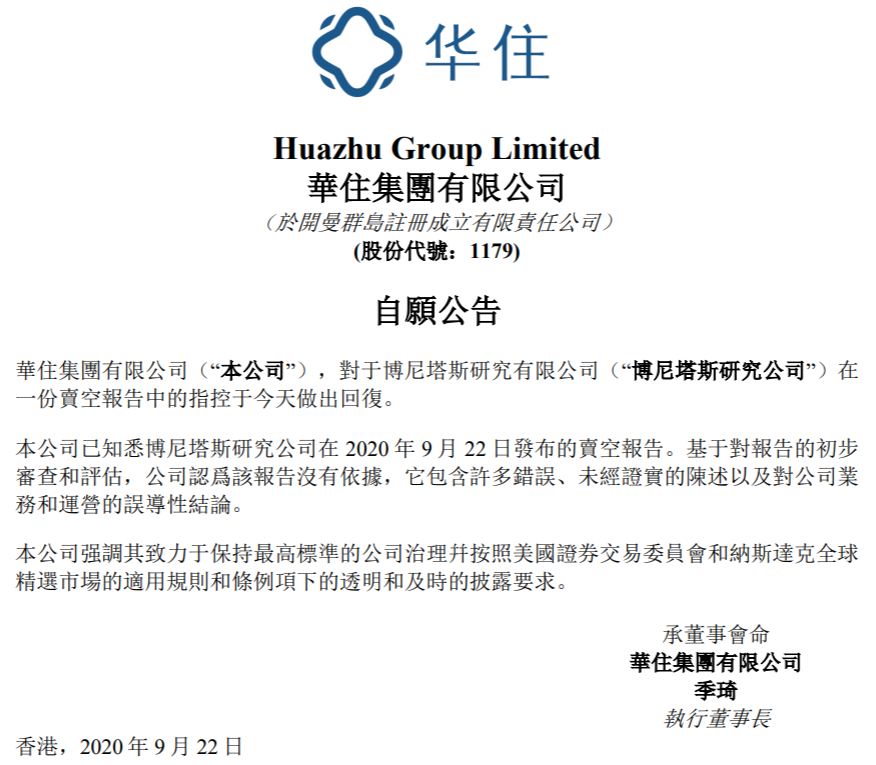 对于上述情况,华住集团9月22日一早作出回应,表示“基于对报告初步的检查和评估,公司认为这份报告是缺乏事实依据的,而且它包含大量的错误、未经证实的陈述,以及对公司业务及运营的误导性结论。”