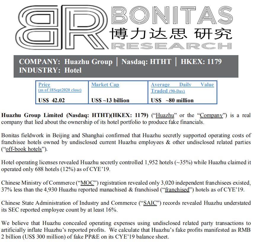 9月21日,Bonitas Research(下称“博力达思研究”)发布沽空报告,指控华住集团利用未披露的关联方交易隐瞒经营费用进行财务造假。