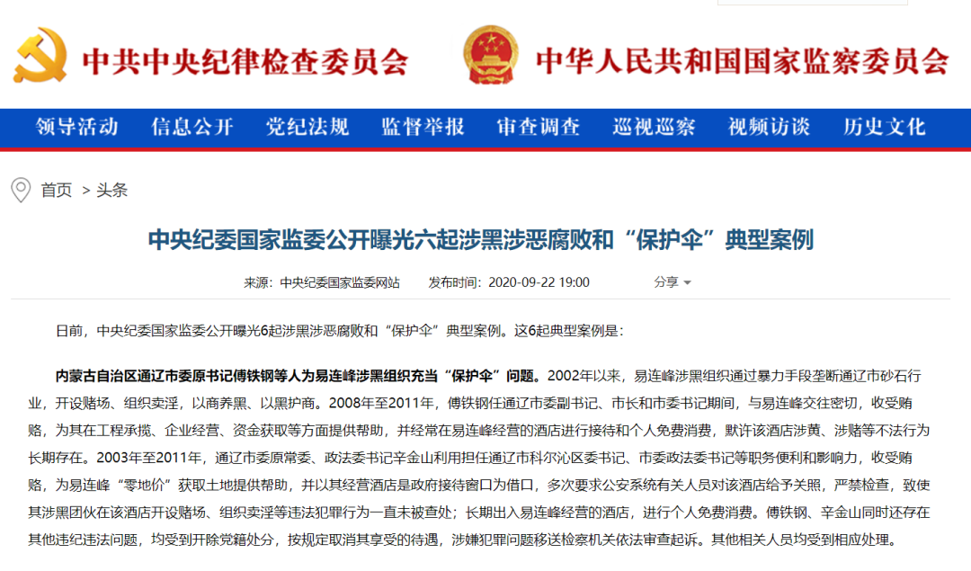 对这6起涉黑涉恶腐败和“保护伞”典型案例,中纪委点评指出,一些党员干部和公职人员严重背离为人民服务的根本宗旨,有的直接组织参与黑恶活动,长期把持基层组织,攫取非法利益,有的明知黑恶势力为非作恶、违法犯罪,却贪欲膨胀,与其沆瀣一气、同流合污,将公权力当作谋取私利的工具,或为其生产经营搭桥铺路、提供资金政策支持,或对其违法犯罪活动有案不立、立案不查,或案发后通风报信、说情抹案,致使黑恶势力坐大成势,大肆侵占国家资源、破坏自然生态,严重危害群众生命财产安全,影响市场经济秩序、侵蚀党的执政根基、破坏党内政治生态。广大党员干部和公职人员要从中吸取深刻教训,引以为戒、警钟长鸣。