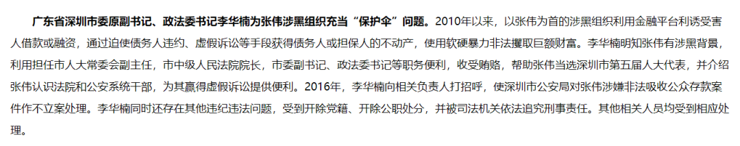 通报称,2010年以来,以张伟为首的涉黑组织利用金融平台利诱受害人借款或融资,通过迫使债务人违约、虚假诉讼等手段获得债务人或担保人的不动产,使用软硬暴力非法攫取巨额财富。李华楠明知张伟有涉黑背景,利用担任市人大常委会副主任,市中级人民法院院长,市委副书记、政法委书记等职务便利,收受贿赂,帮助张伟当选深圳市第五届人大代表,并介绍张伟认识法院和公安系统干部,为其赢得虚假诉讼提供便利。2016年,李华楠向相关负责人打招呼,使深圳市公安局对张伟涉嫌非法吸收公众存款案件作不立案处理。李华楠同时还存在其他违纪违法问题,受到开除党籍、开除公职处分,并被司法机关依法追究刑事责任。其他相关人员均受到相应处理。