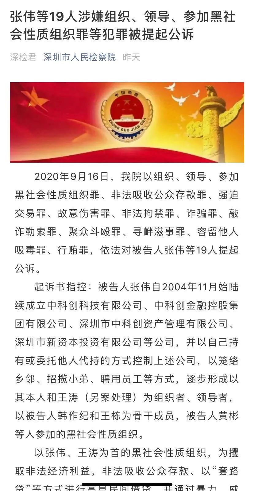 9月16日,深圳市检察院以涉黑等11宗罪对ST中科创(002290)实际控制人张伟提起公诉。具体请戳:唏嘘!又有A股实控人栽了:被控涉黑涉毒等11宗罪,昔日百亿帝国再转型
