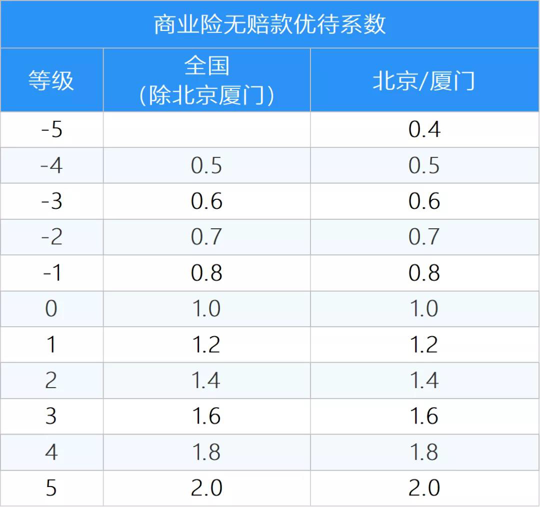 无赔款优待系数会综合考虑最近三年的连续投保和理赔情况,北京和厦门一类,分为-5至5共11个等级,系数范围为0.4至2.0。全国其它地区一类,分为-4至5共10个等级,系数范围为0.5至2.0。