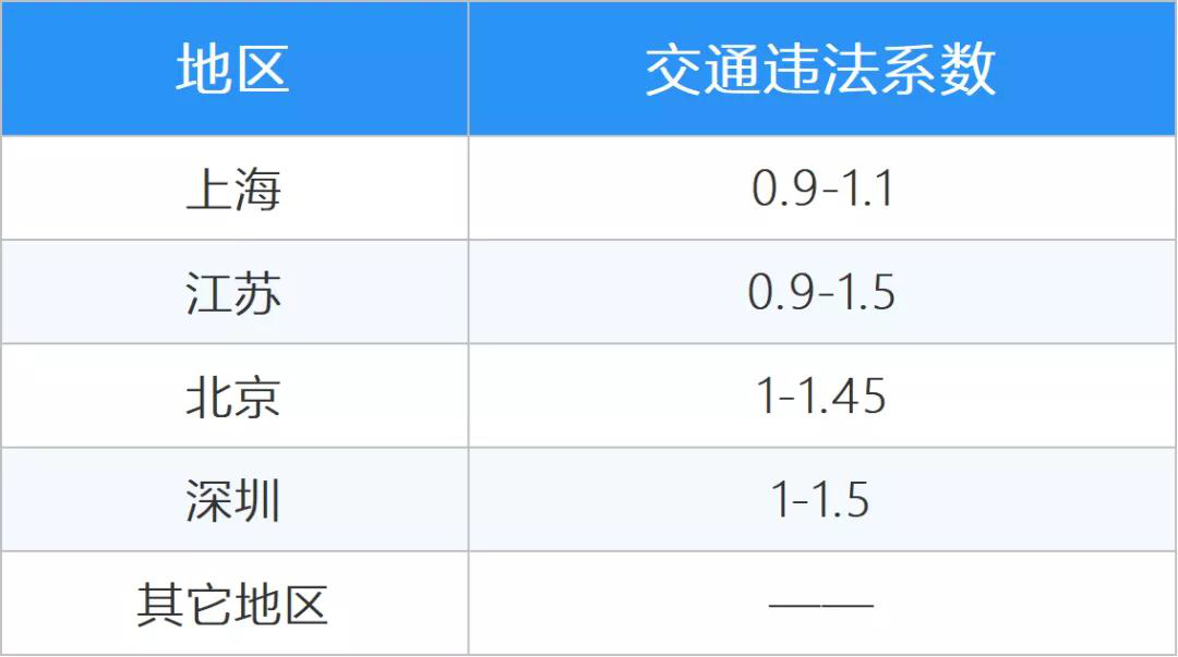 交通违法系数,目前只涉及上海、江苏、北京、深圳四个地区,系数范围为0.9-1.5。某财险公司管理层直言,“其他地区一般都按照1来处理,不管有没有违法。”