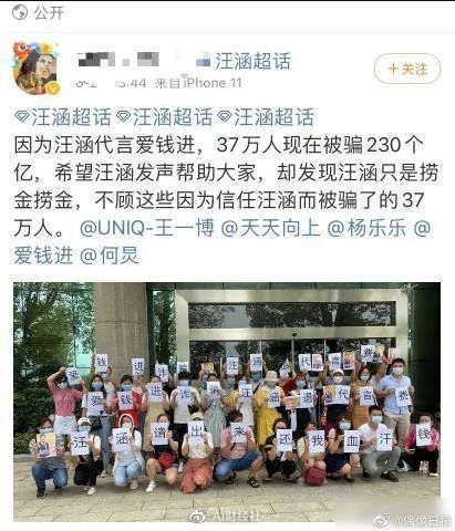 有网友在微博发文称汪涵代言的金融理财产品涉嫌诈骗,有37万人被骗了 230 个亿,配图是受骗群众举字幅称“爱钱进诈骗汪涵退代言费,汪涵请出来还我血汗钱”。同时也有很多受骗的网友在各个平台都表示当时都是看了汪涵的广告,相信汪涵才把钱放在涉事理财产品中,强调汪涵需要为此事负责。