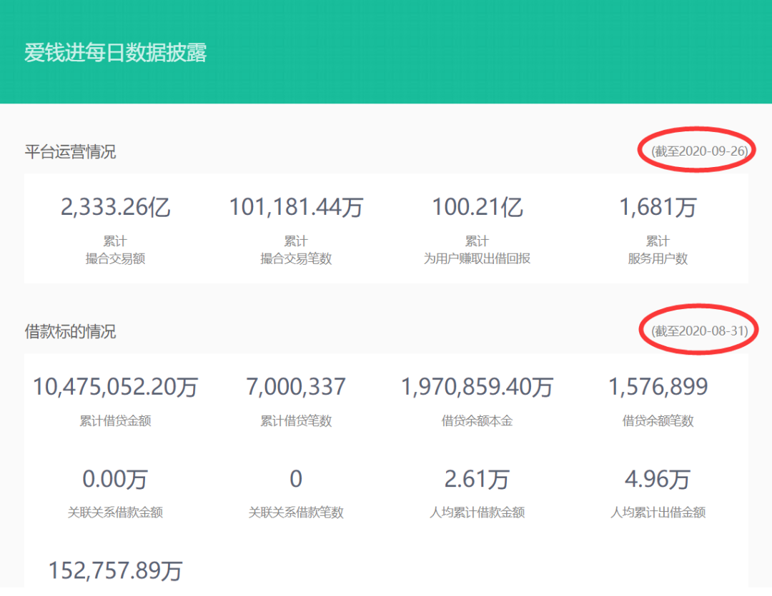 从爱钱进的官网上来看,截止到目前,爱钱进平台还在运营中,平台官网的数据披露截至时间为2020年9月26日,借款标情况截至时间为2020年8月31日,借贷余额尚有197亿。
